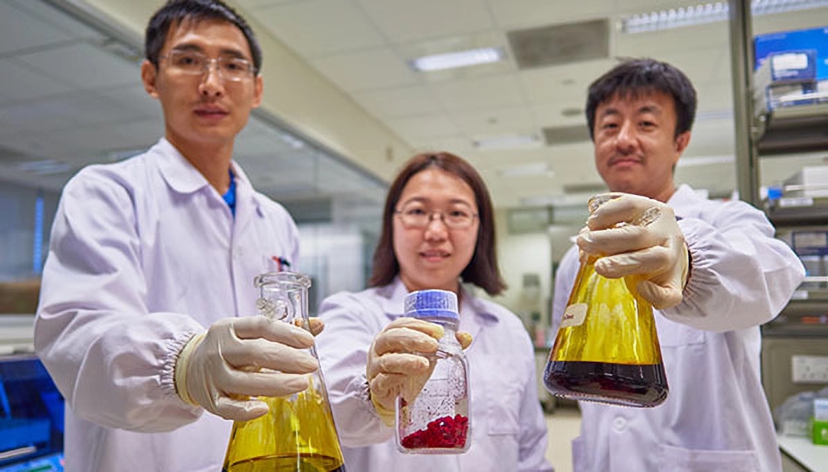 Dr Chen (centre) and her teammates with the extracted lycopene. (Photo credit: A*STAR)
